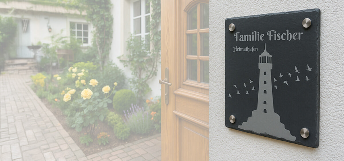 Gestalte deinen Eingangsbereich individuell mit einem hochwertigen, wetterfesten Schieferschild. Ob Familienname, Haustiername oder Spruch – jedes Schild wird nach deinen Wünschen graviert. Einfach online gestalten, Design prüfen, Produktion freigeben und kostenlos innerhalb Deutschlands versenden.